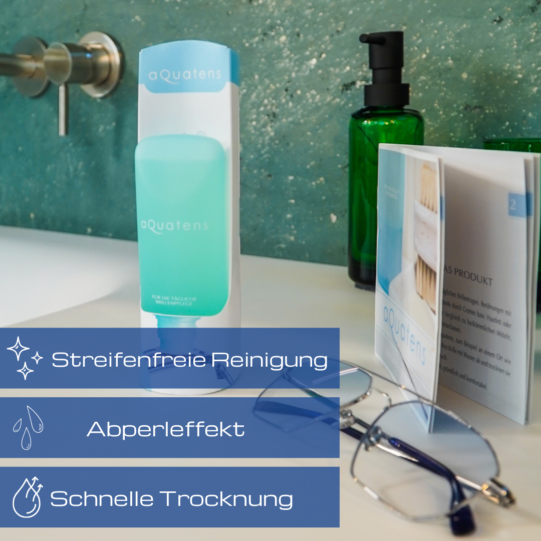 aQuatens 75ml besteht aus dem Pflegereiniger und dem saugfähigen Spezialtuch (30 X 25 cm).